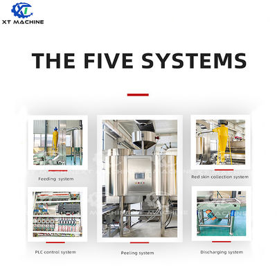La macchina pneumatica per il blanchiment delle arachidi comprende una trampoliera, un ascensore, un contenitore di ricezione, un dispositivo di pesatura automatica, un dispositivo di sbucciatura, un dispositivo di aspirazione della pelle rossa, uno schermo vibrante di scarico,un raccoglitore di polveri da ciclone, e un compressore d'aria (autoprodotto) L'intero equipaggiamento è suddiviso in cinque parti: un sistema di alimentazione, un sistema di peeling, un sistema di raccolta della pelle rossa, un sistema di scarico,e un sistema di controllo PLC.